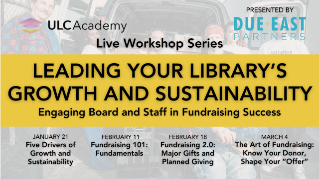 This four-part series from Due East Partners offers practical, engaging tips and tools to strengthen your library’s fundraising capacity and deepen your connection to current and future supporters.